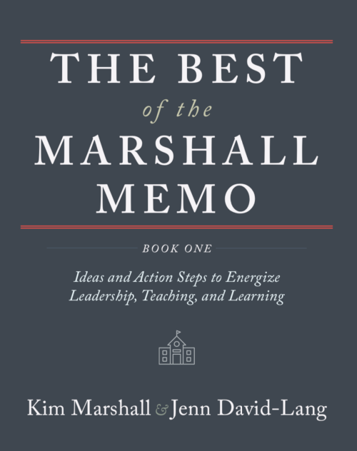 “The Marshall Memo is a wonderful resource for educators. Every week, it brings together and summarizes the best of education-related writing from a wide array of sources. I always find something of interest in each issue. In this second volume of The Best of the Marshall Memo, Kim Marshall and Jenn David-Lang share the best of the best, organized by topics. For example, in a chapter titled “Race and the Education of American Students,” there are nineteen article summaries on topics ranging from handling discussions of race in the classroom to helping black males succeed, to culturally responsive teaching. Each summary is well-written and gets right to the core of the issues and effective responses to real problems. The Marshall Memo itself, and the book based on it, put readers into real-life classrooms with real kids. You can almost smell the broccoli cooking in the cafeteria and hear the busses pulling up outside as you read these insightful, inspiring, and pragmatic discussions of issues faced by teachers, principals, and other educators.”